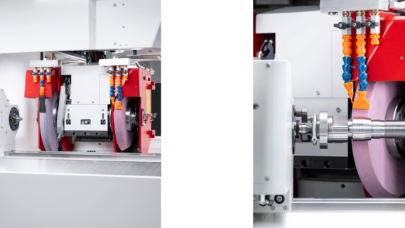 - 自動 B 軸(1° Hirth 齒槽連結),可配置最多三個研磨刀具(兩個外圓砂輪與一個內圓砂輪)