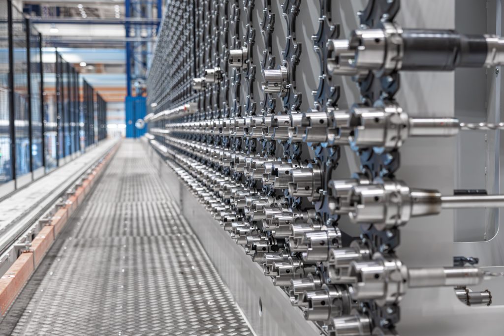 Gantry Tool Storage(GTS) 可儲存超過 750 把切削刀具,並規劃它們於五台臥式加工中心及一台大型門型機間的使用時序。系統在刀具即將使用前將其準時配送至對應機台,並於磨耗後自動回收刀具至刀具室進行再研磨。
