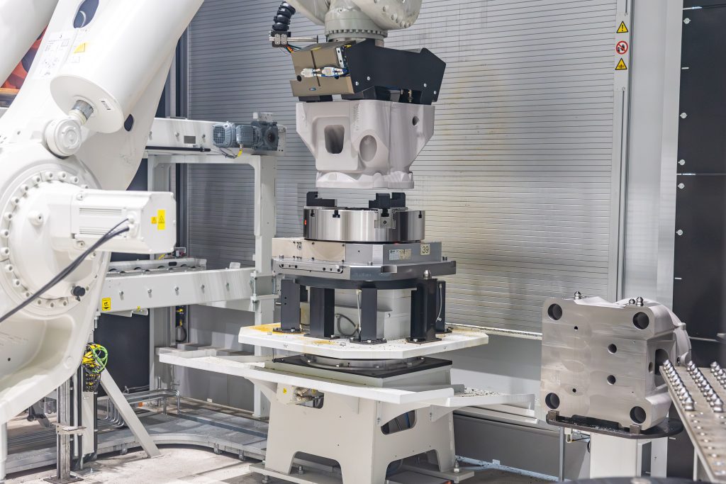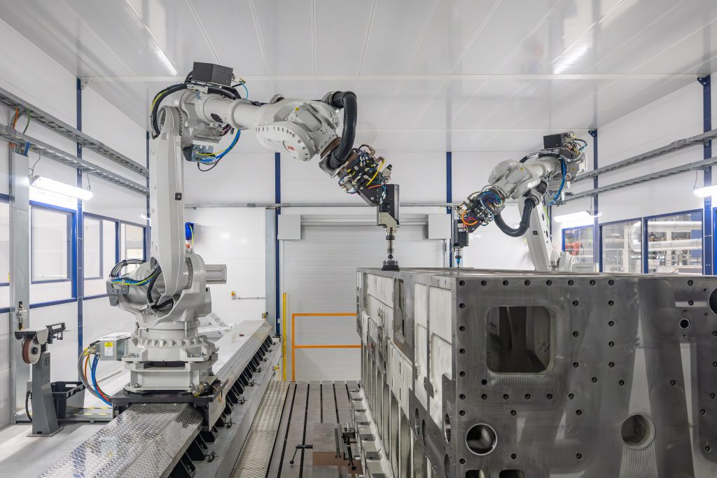 Robotic Finishing Cell(RFC) 由兩組機械手臂執行引擎本體的去毛邊作業,確保品質一致與高效率完成。