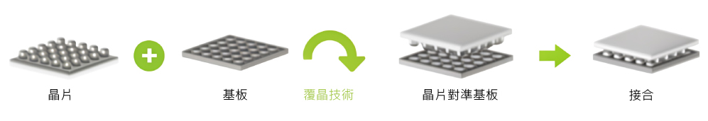 覆晶接合是從機械和電學方個方面,將晶片組裝置基板的互連技術。通常尺寸較小的芯片會至於上方。通過翻轉、對準、然後接合到基板上。