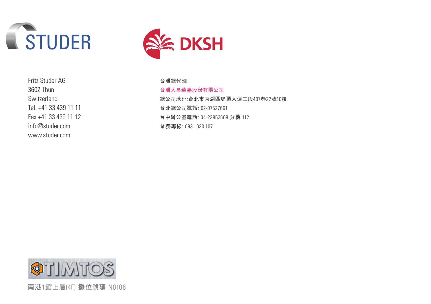 全台最大的國際工具機展 TIMTOS 將在3月 4至 9號於台北南港展覽館盛大開幕!今次大昌華嘉展出品牌多達 30 多種創歷年新高,不僅研磨專家Studer 將會於現場實機示範S41精準研磨技術,最新引進台灣、歐美大廠都風靡的油霧回收機 Elbaron 與 廢水處理器Evaled 也會現場展示機器並特別邀請了原廠來做解說與互動。另有Klingelnberg, Salvagnini, Borer 等各領域應用解決您所有工業應用上的需求。有興趣者可透過下面報名諮詢搶先了解體驗 !