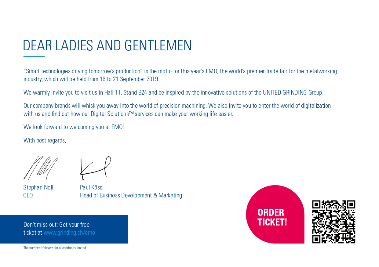 特別邀請您屆時來參訪Hall 11, B24 United Grinding 攤位,看我們齊備且技術尖端的解決方案。我們的品牌將會帶領你見識精準加工的極致,並跟我們一起踏上數位時代了解United Grinding 的 Digital SolutionsTM 服務如何能增進您工作上的效能。