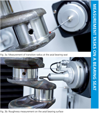 如軸向軸承座,則有不同的測量任務:一方面要測量徑向和軸向軸承表面之間的過渡圓角半徑(見圖3a),另一方面要測量軸向軸承表面的粗糙度(見圖3b)。粗糙度的測量,要使用帶滑動導頭的測頭,根據不同測量任務,裝備有尖點半徑5 µm或2 µm的探針。這樣就可以在精密測量中心上直接進行符合標準的粗糙度測量。