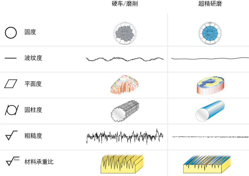 超精研磨加工的另一個優勢是工件幾何形狀的改善。因為磨料會接觸零件的某個區域,所以與零件表面的低處區域相比,其高處區域被切削得更徹底。根據超精加工的應用,這意味著更好的平面度,更好的圓柱度,以及更精確的曲率。