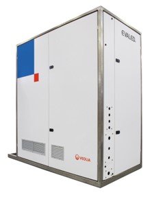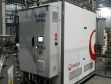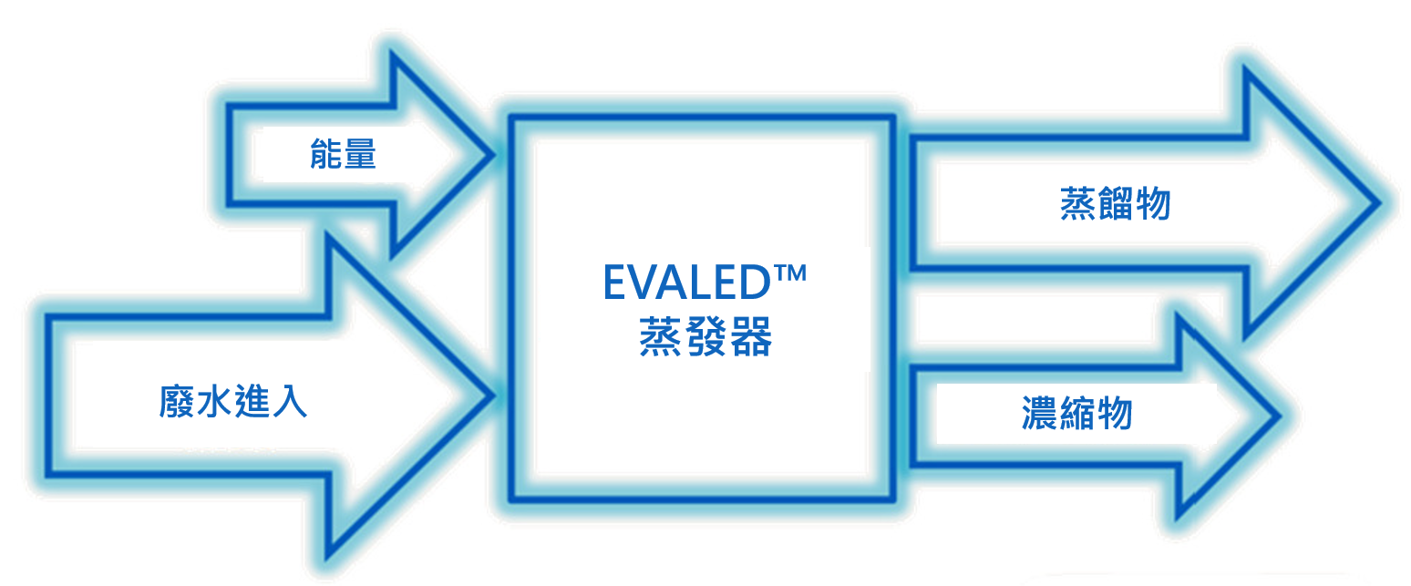 基於節能技術機械蒸汽壓縮 MVR. 高溫(80-90°C / 175-195°F) 熱藉由內部流體的垂直管路和自然迴圈傳遞至管道和煮沸室中不同密度的廢水。