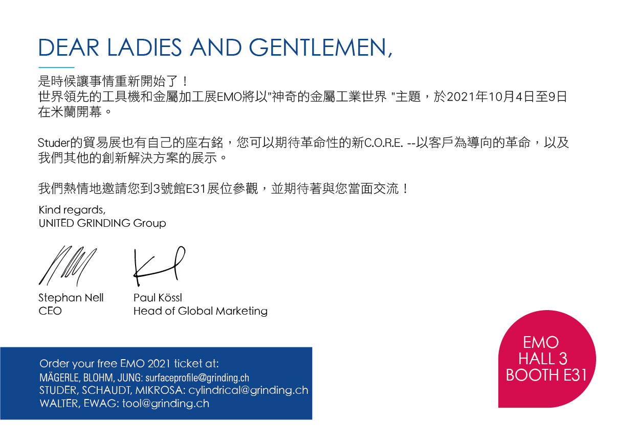 若不能到UNITED GRINDING Group的展位,開幕儀式也將在 grinding.ch/emo-2021 網站上進行在線直播。 敬請收看!