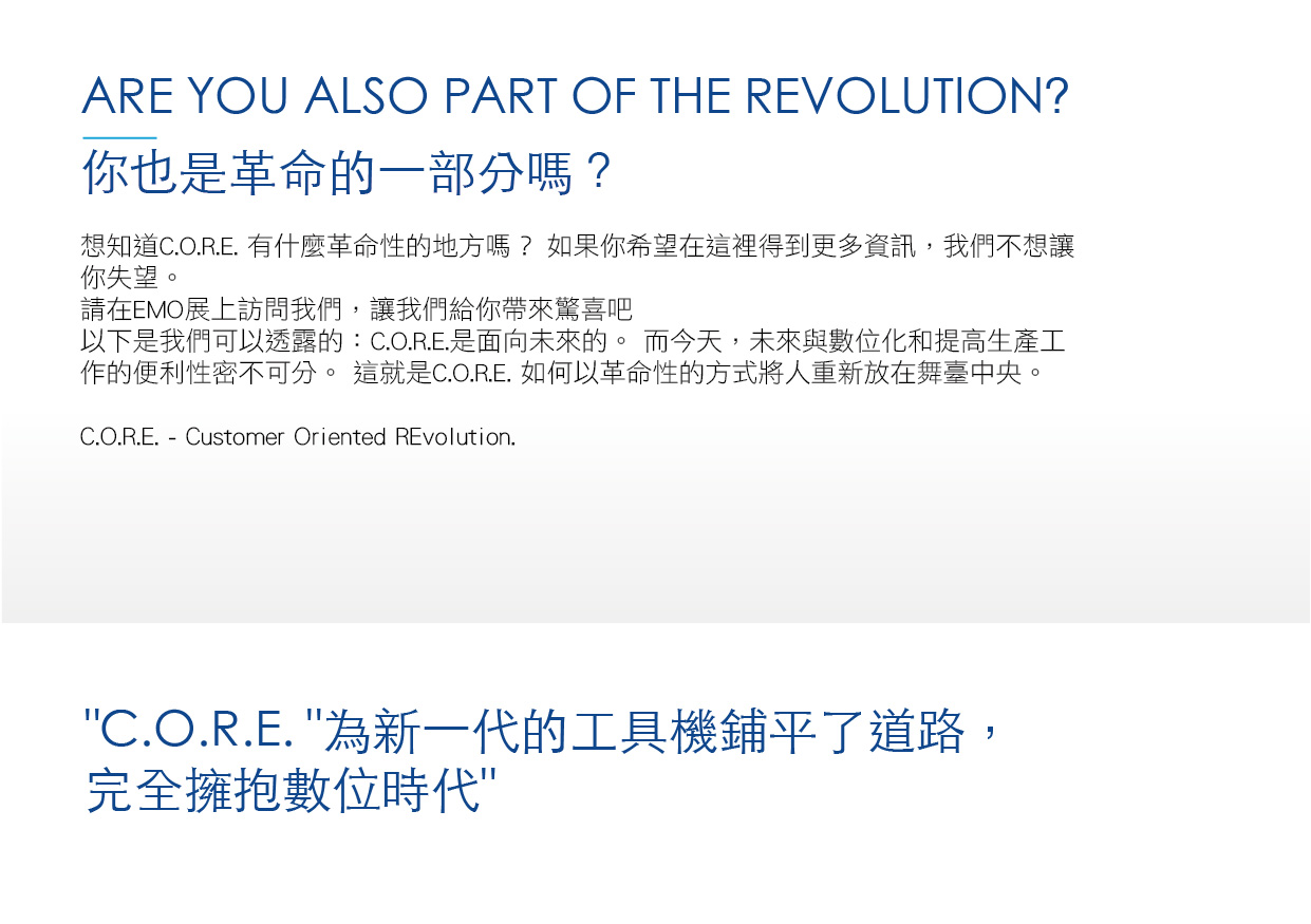 您可以期待革命性的新C.O.R.E. --以客戶為導向的革命,以及我們其他的創新解決方案的展示。