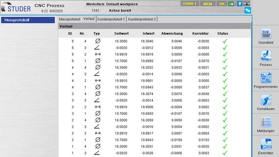 另外,STUDER專用測量循環中不僅可以用雷射測量設備記錄不同的直徑,還可以對 "非連續 "的直徑進行精確的控制測量,如直徑範圍內有鍵槽或縱槽的軸和齒形齒輪(見圖2),省去了以前使用接觸式測量裝置的設置和重新設置,效率大幅提高。測量循環可根據需要在每次加工操作後或磨削循環結束時選擇。STUDER軟體在每個測量循環後皆會記錄各直徑的測量值(見圖3)。通過這一過程,操作人員可一目了然地確定磨削工件的質量。